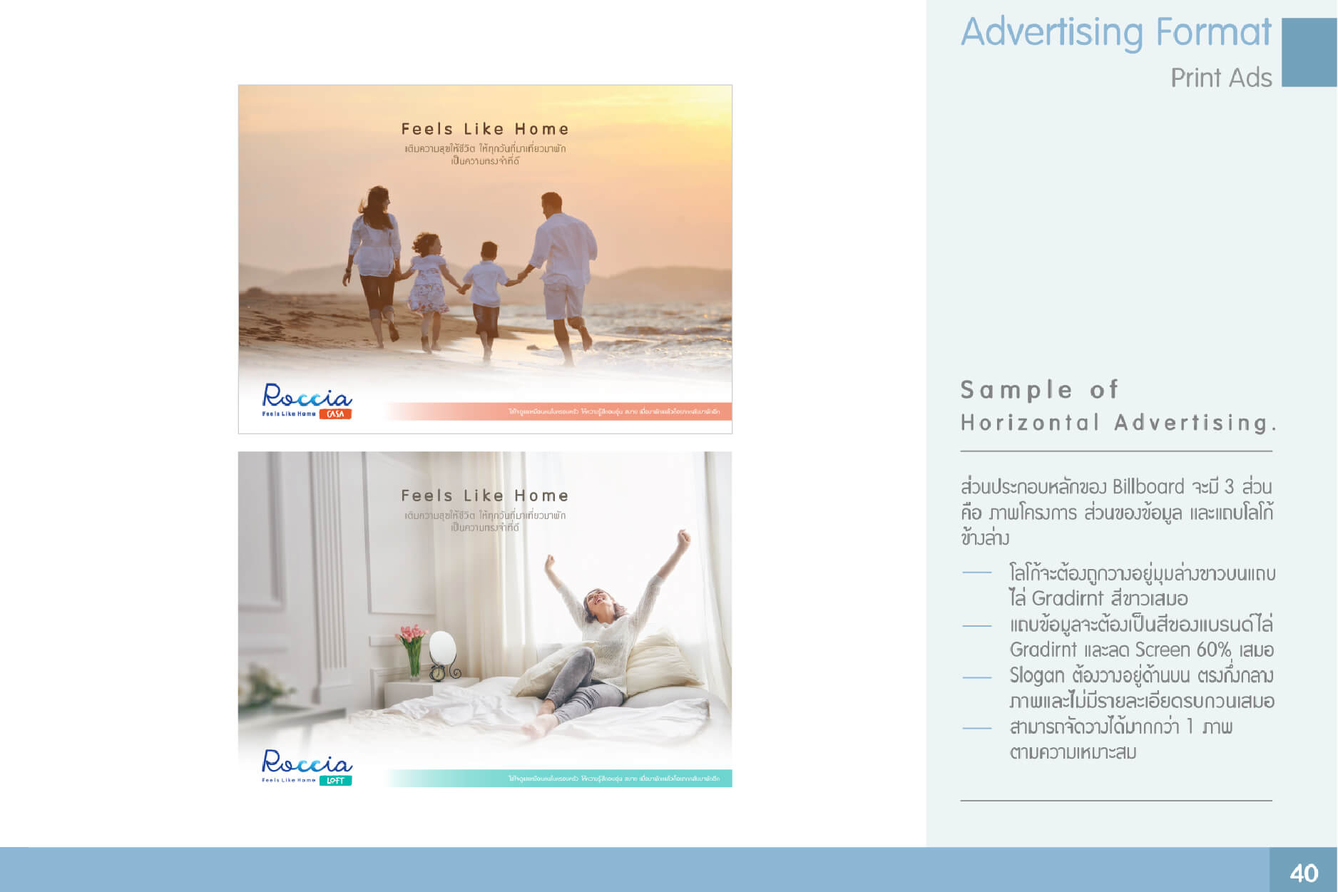 The wave shape is used as a part of the logo design to create a relax and comfortable mood & tone with the vivid color brush stroke to emphasize the different resident locations. Implement the graphic elements in the advertising guideline and format for communication materials.